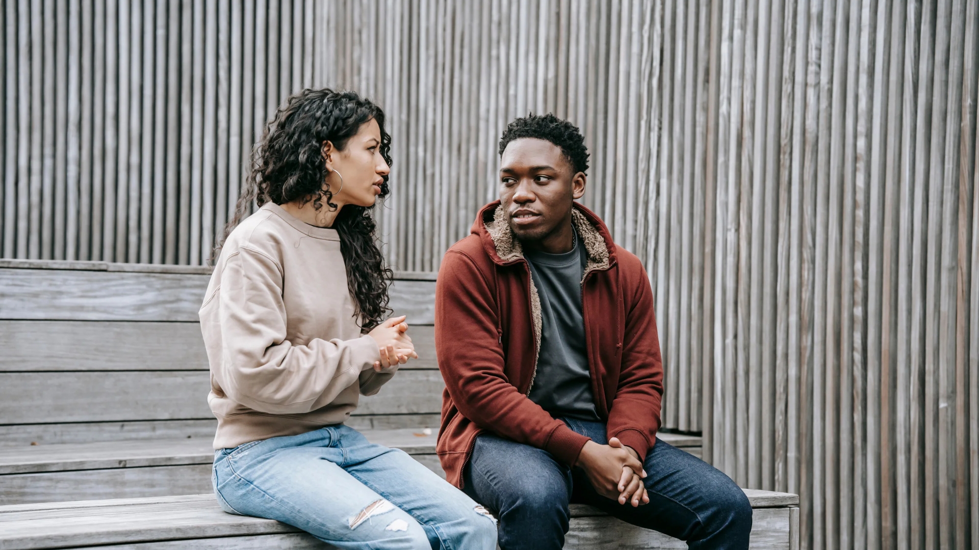 A young woman talking to a you man sitting on wooden stairs