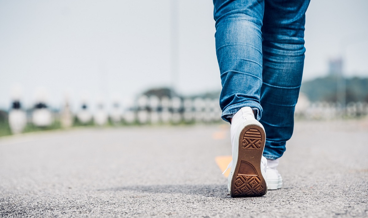 Close up woman wear jean and white sneaker walking forward on highway road in sunny day