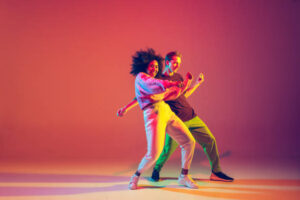 Drive in motion. Stylish man and woman dancing hip-hop in bright clothes on green background at dance hall in neon light. Youth culture, movement, style and fashion, action. Fashionable portrait.